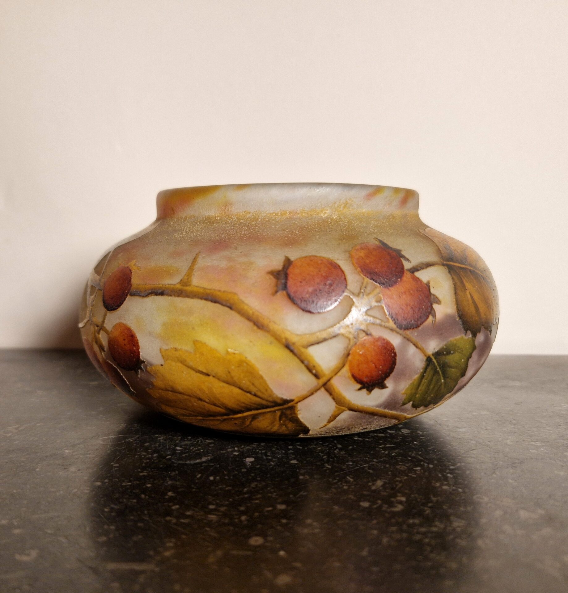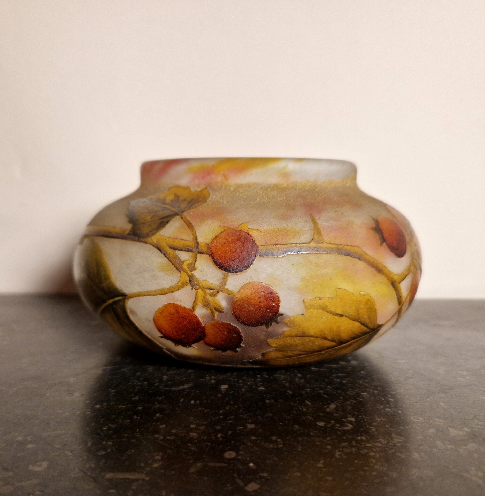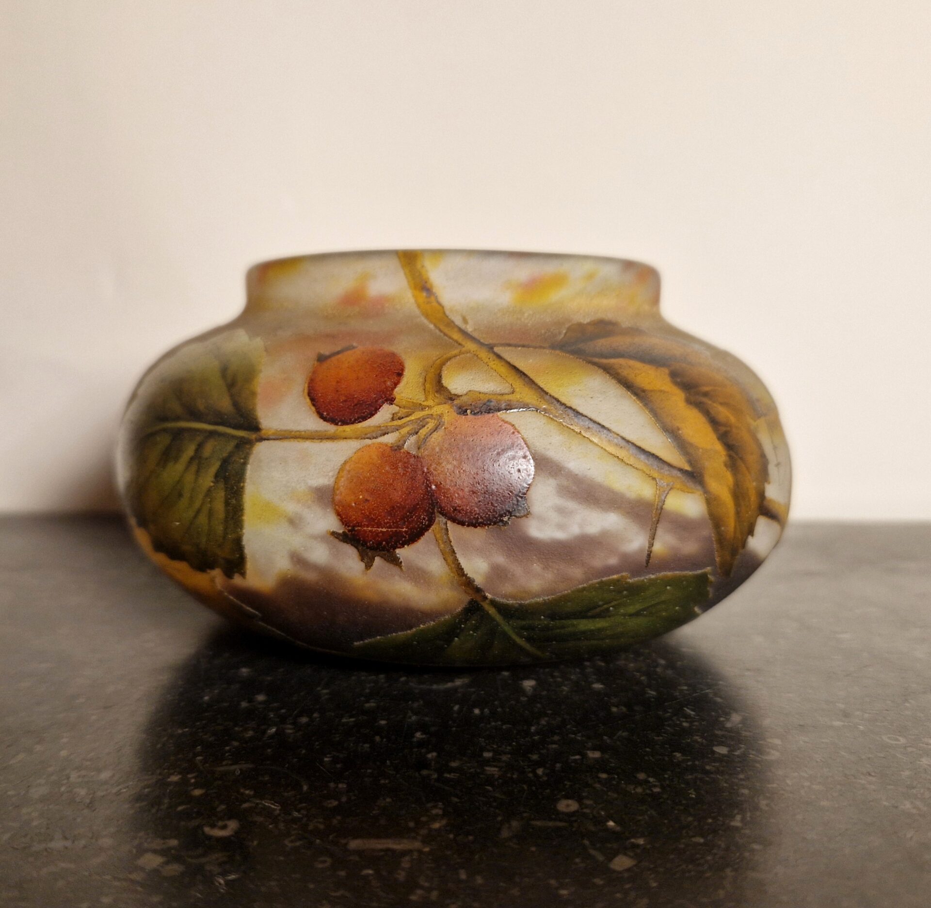 Raffinata coppetta in vetro multistrato, lavorata all’acido con raffinata decorazione a motivo di bacche. Firmata