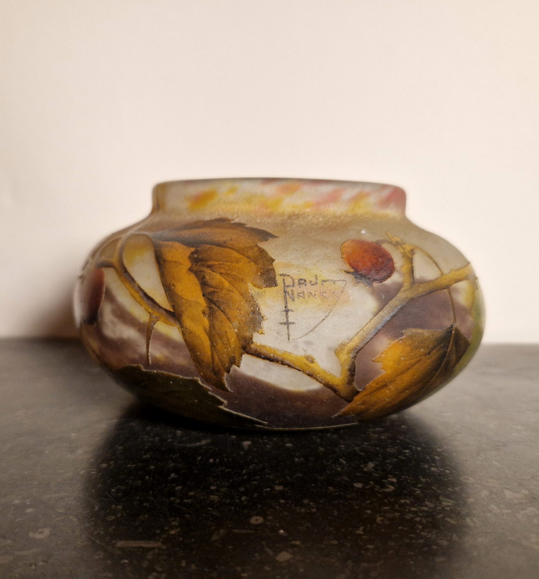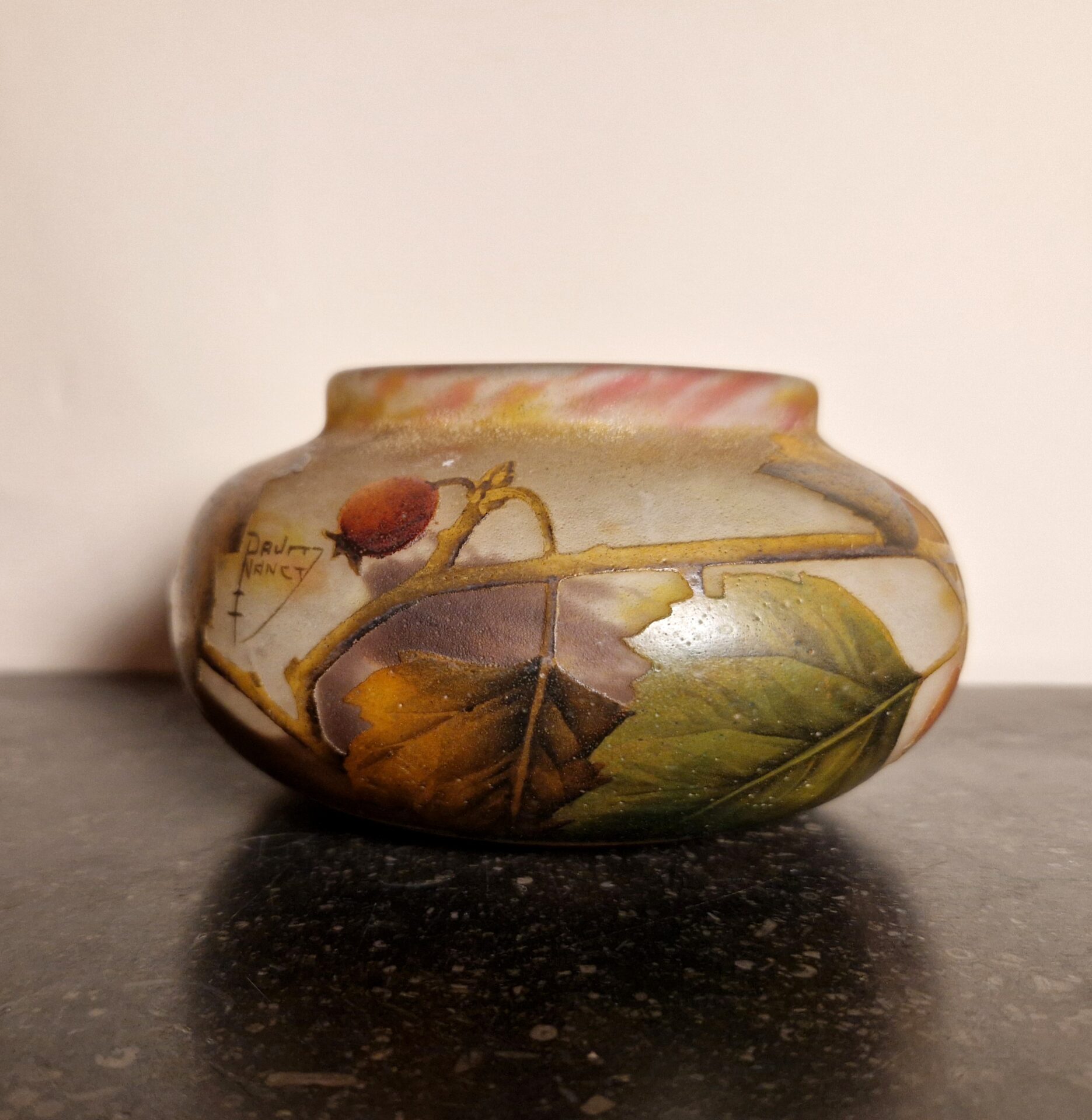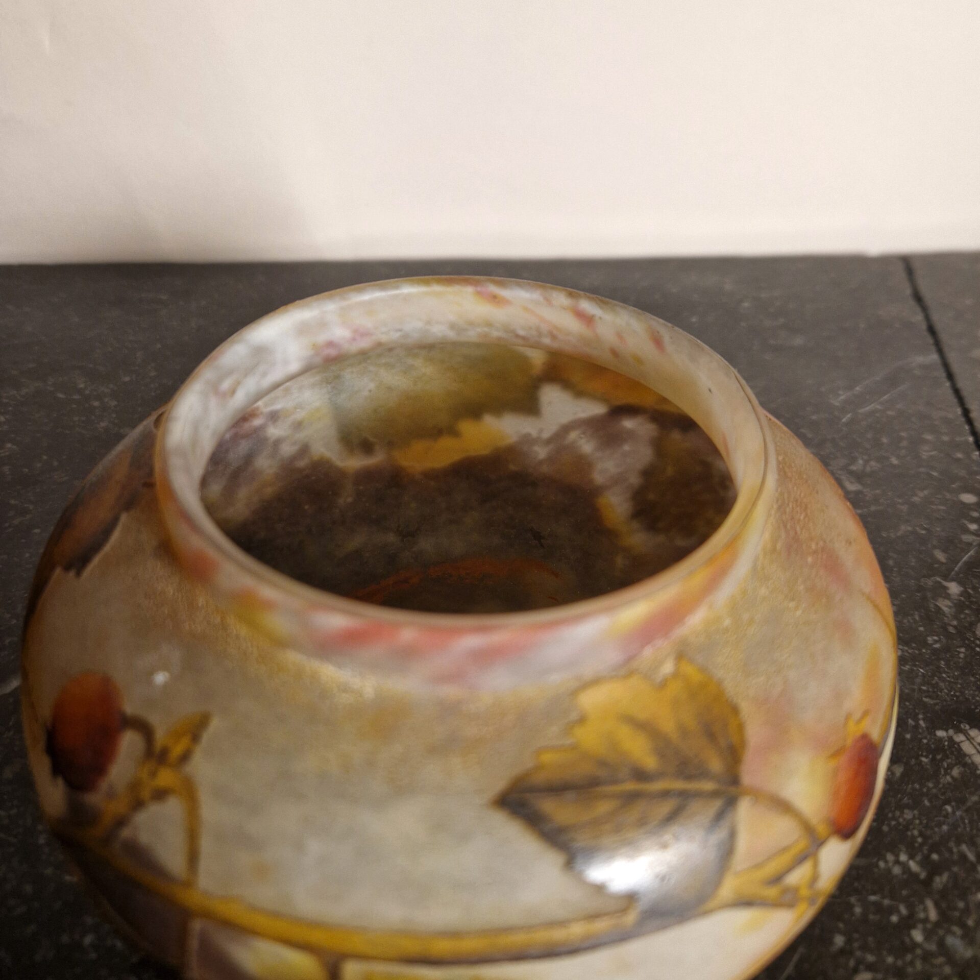Raffinata coppetta in vetro multistrato, lavorata all’acido con raffinata decorazione a motivo di bacche. Firmata
