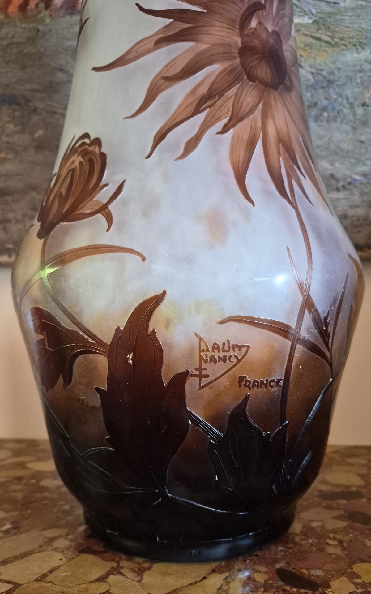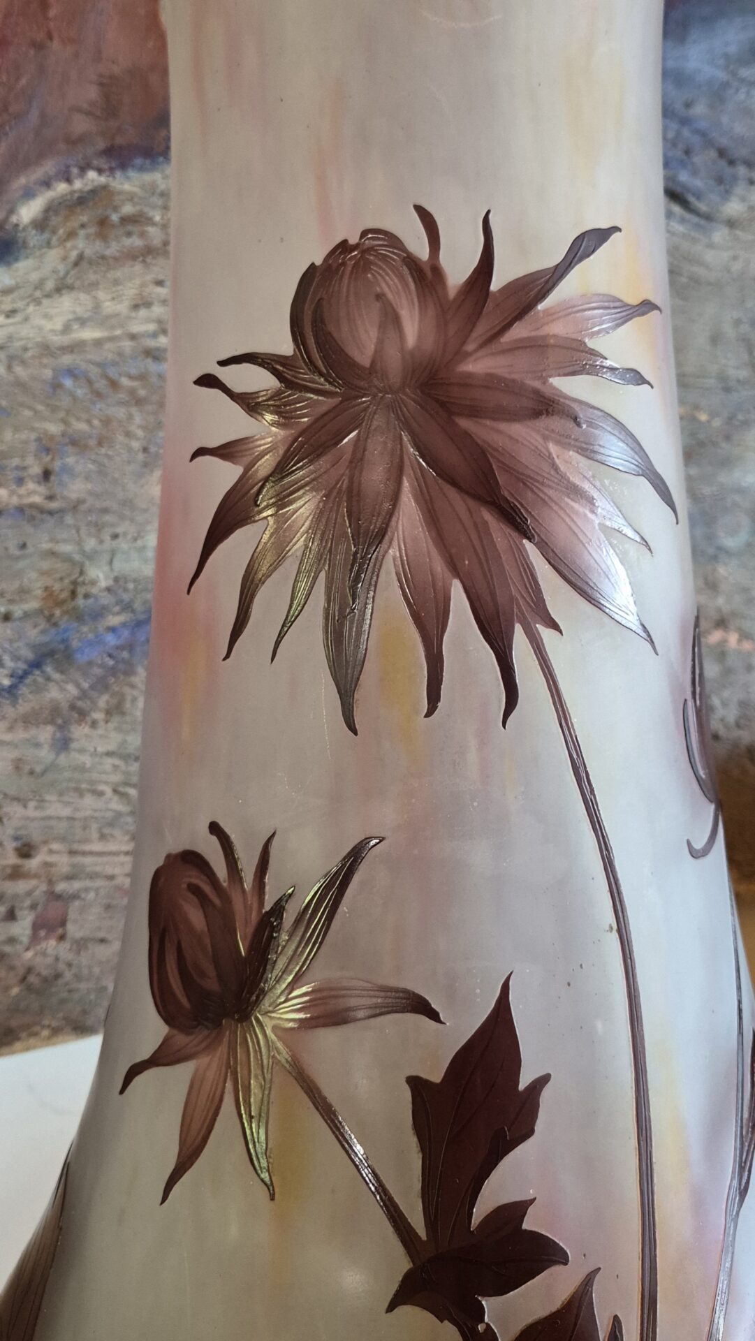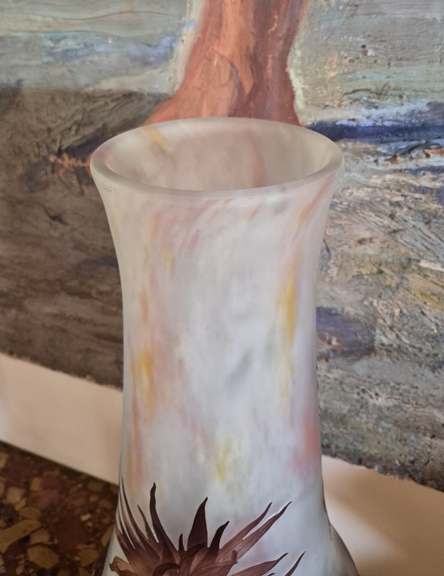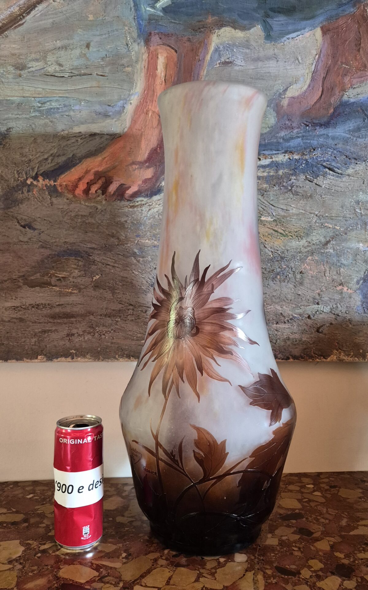 vaso in vetro multistrato , lavorato all’acido e con raffinata decorazione a motivo floreale di dalie. Firmato Daum