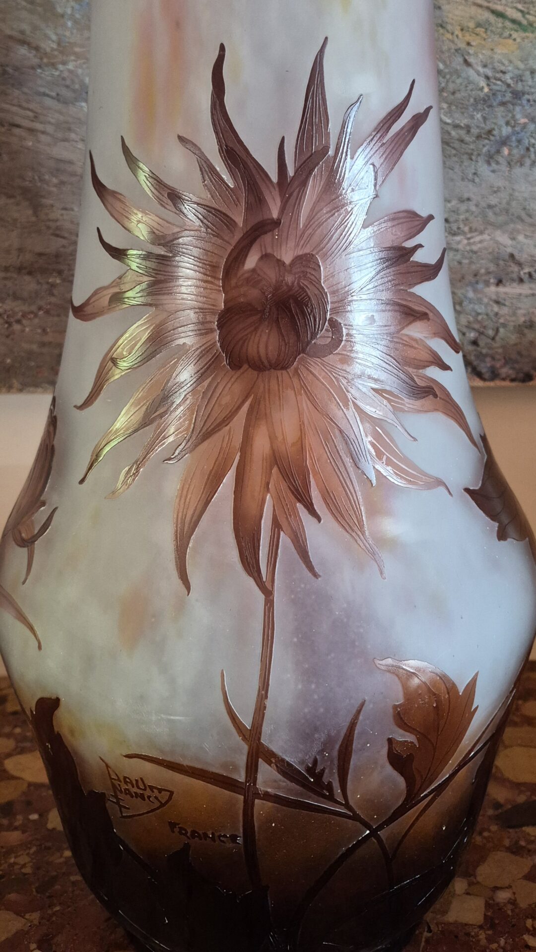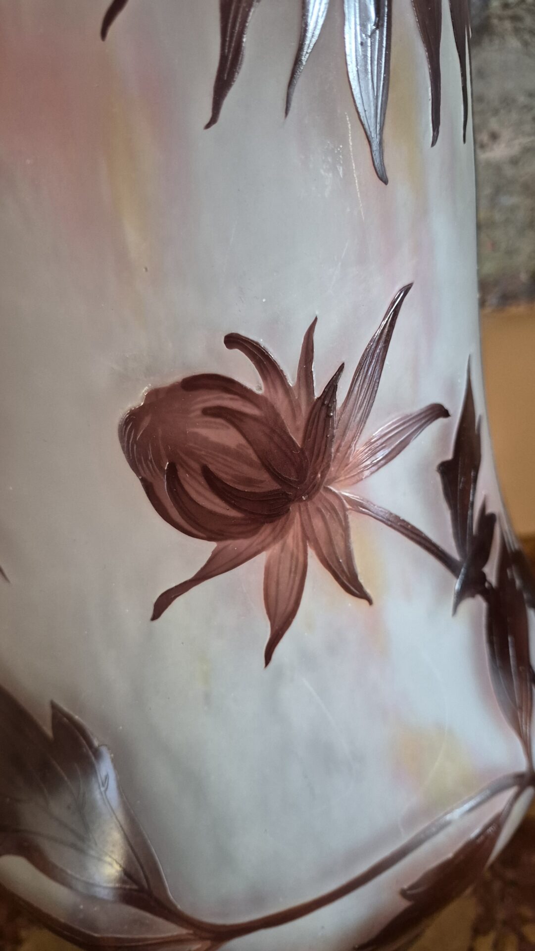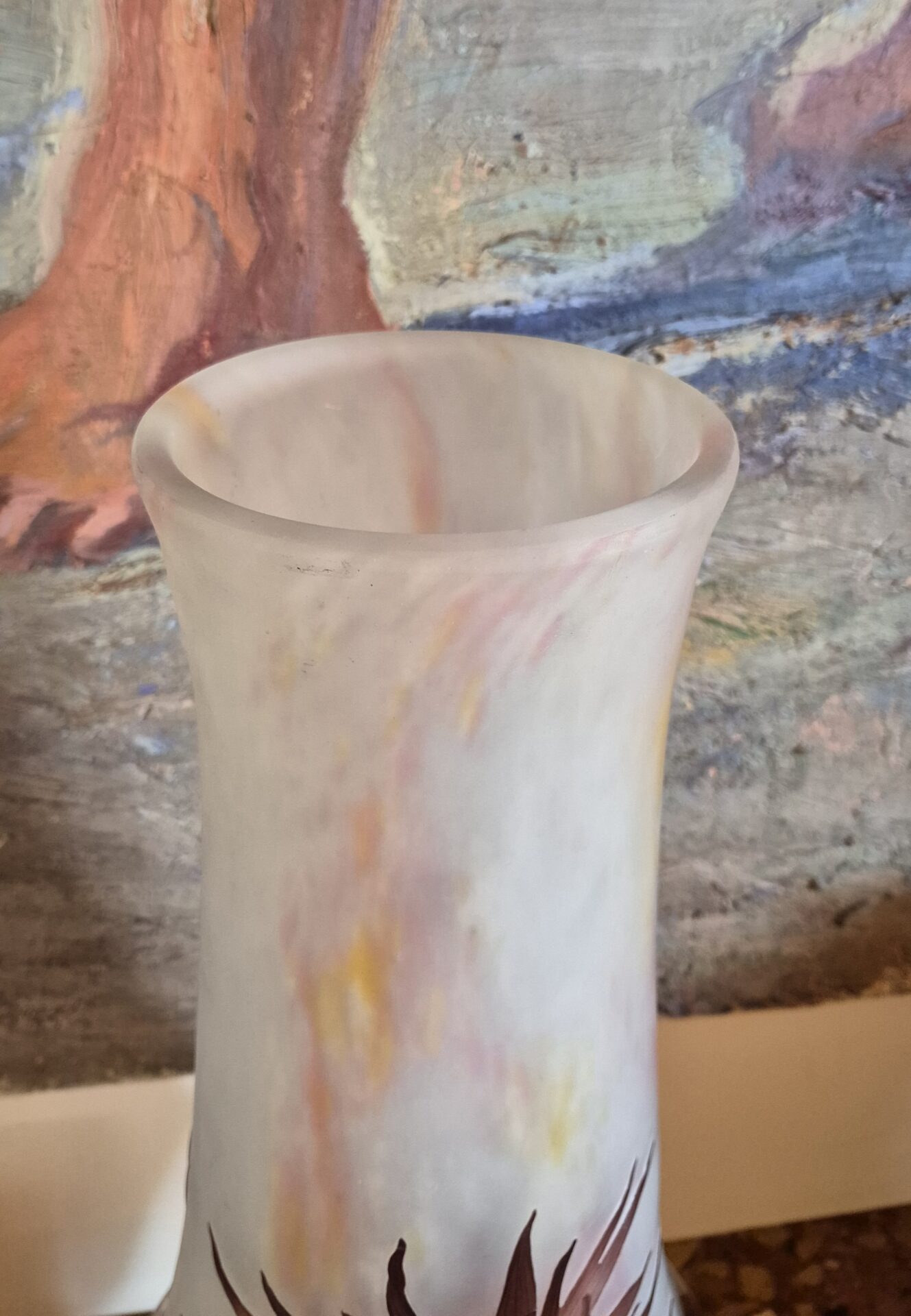 vaso in vetro multistrato , lavorato all’acido e con raffinata decorazione a motivo floreale di dalie. Firmato Daum