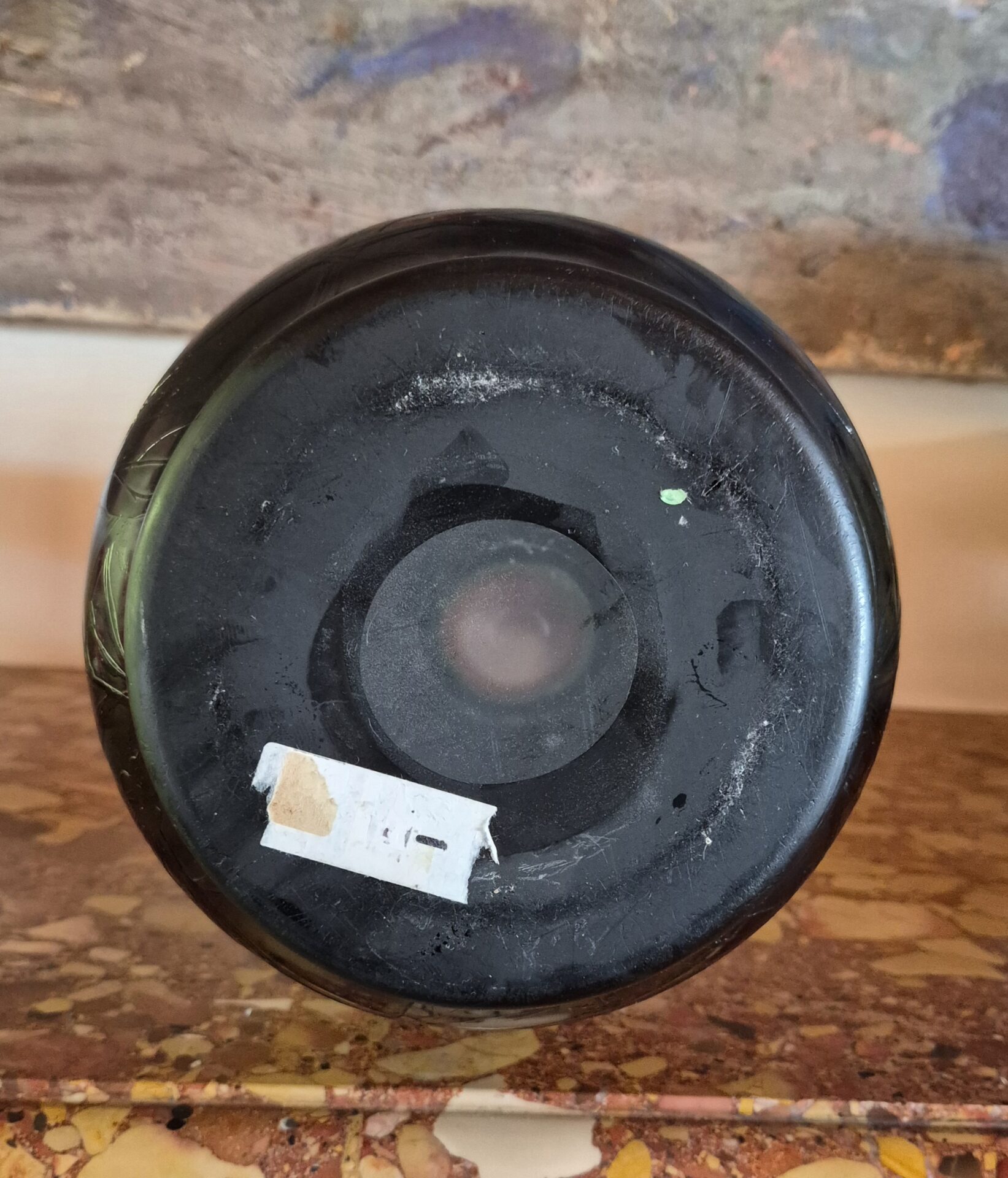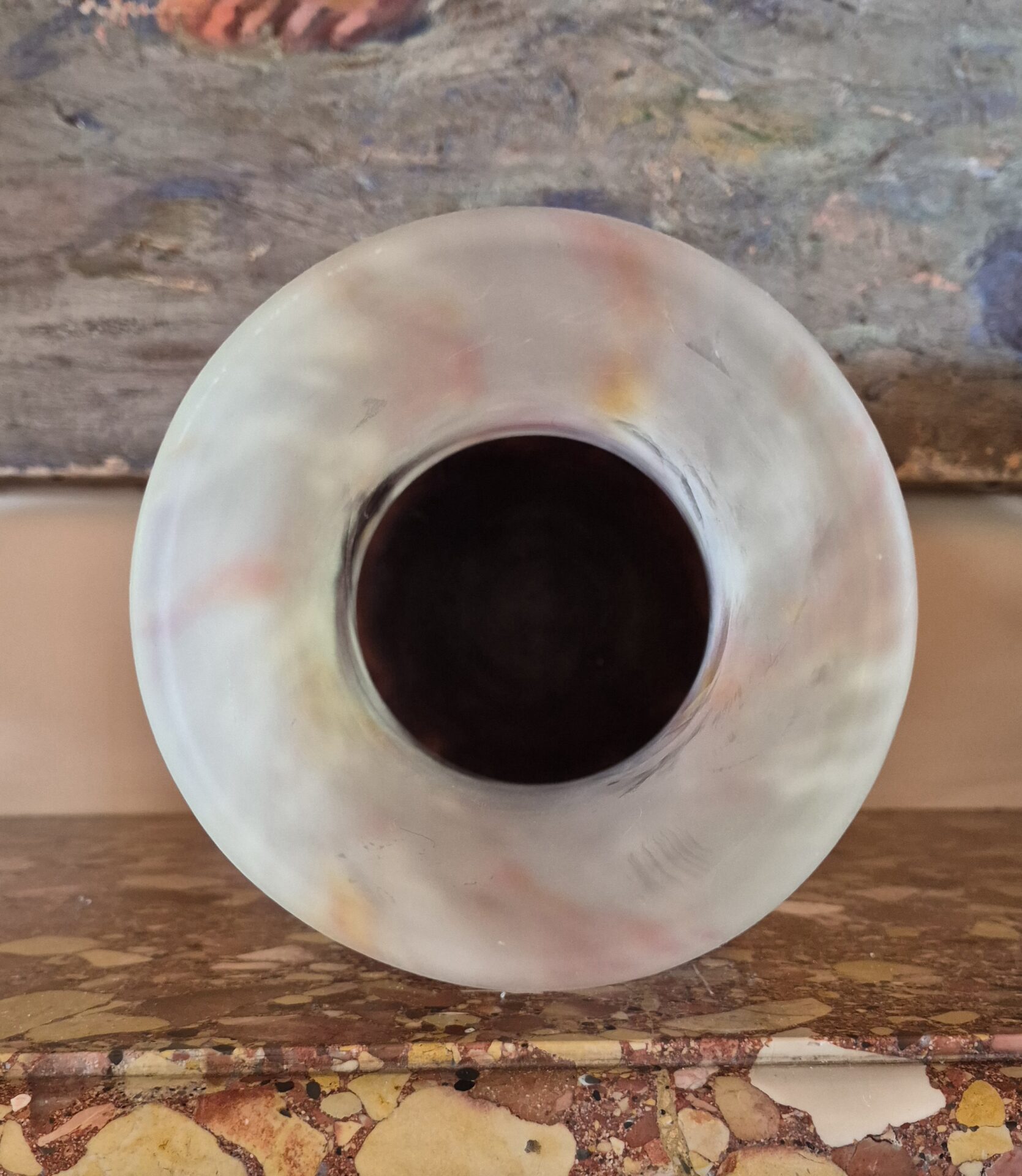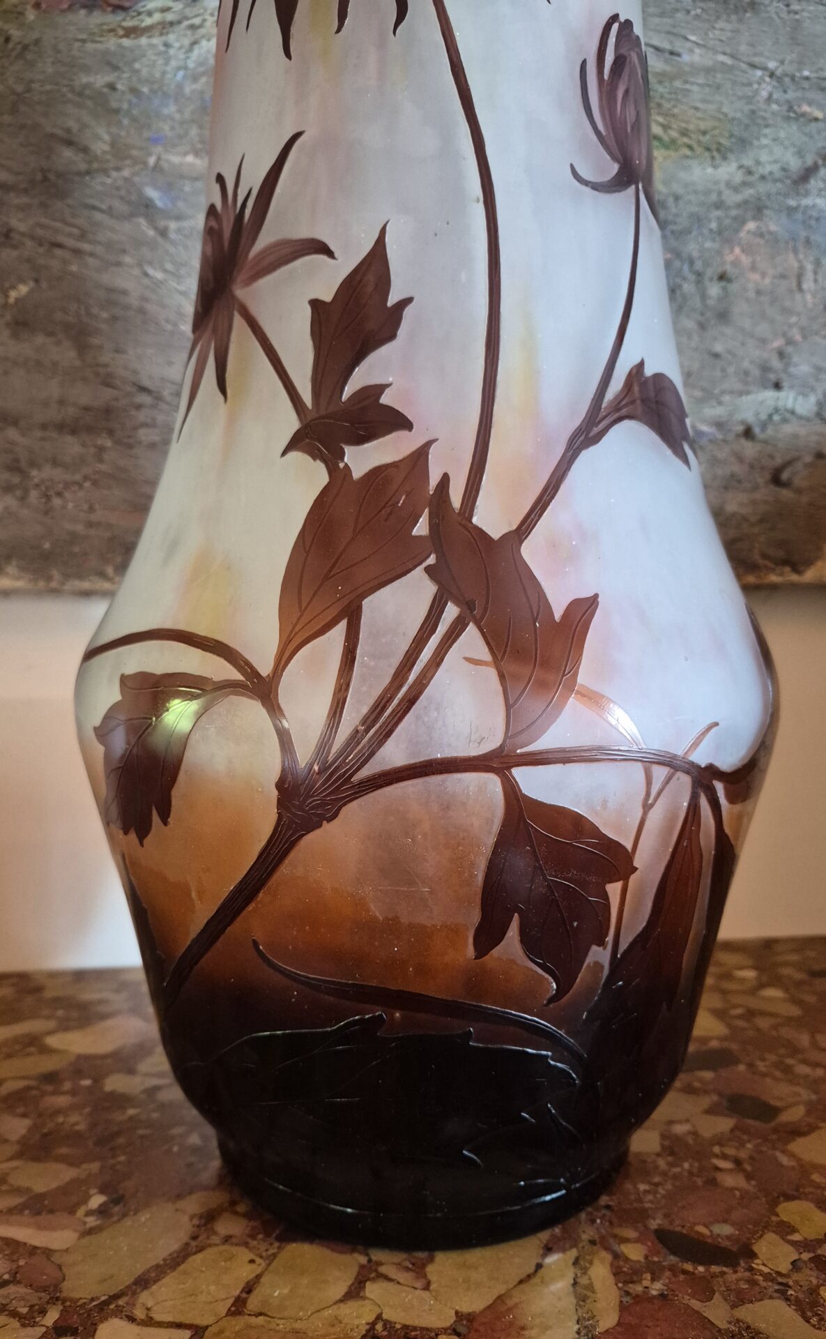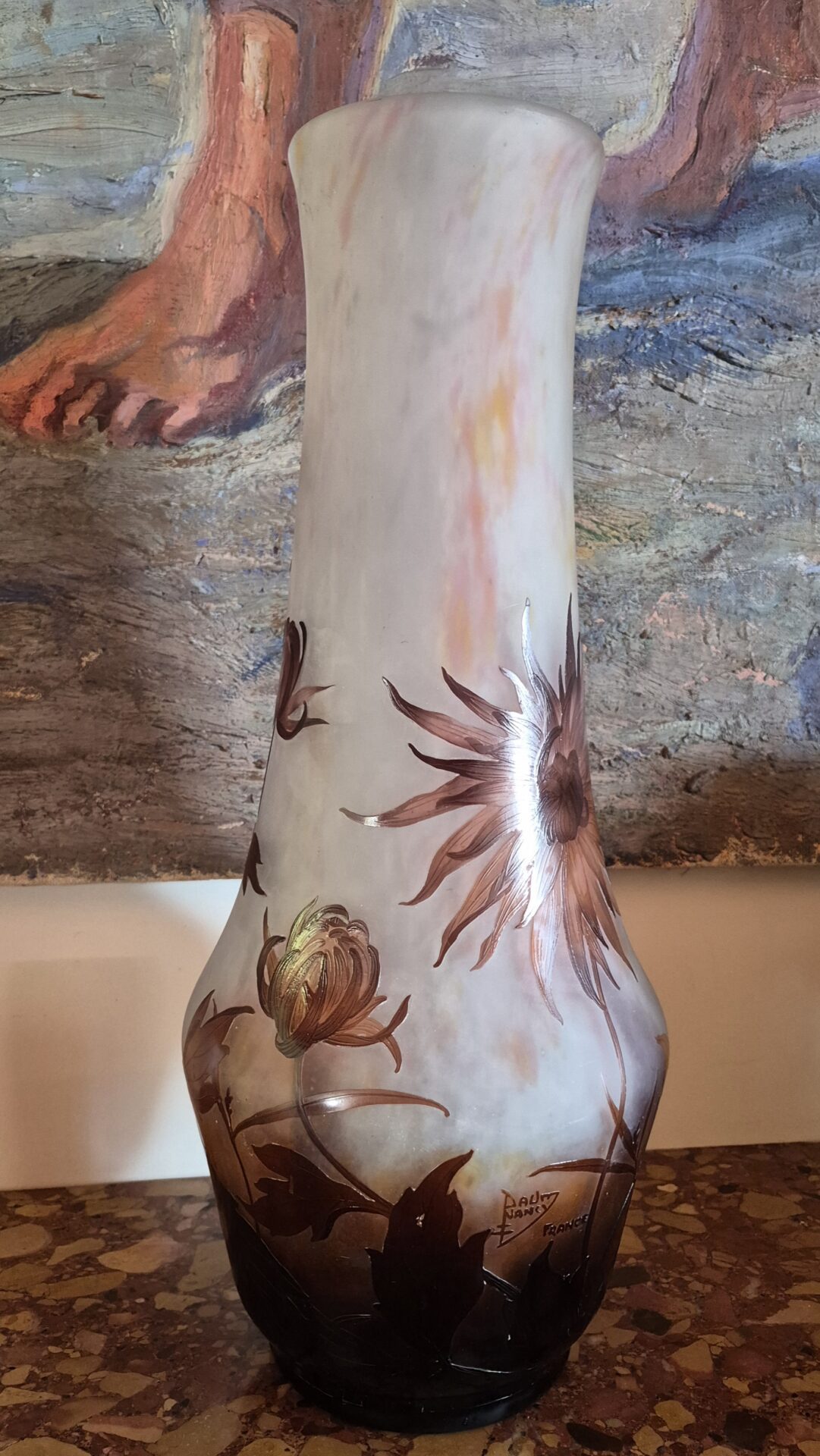 vaso in vetro multistrato , lavorato all’acido e con raffinata decorazione a motivo floreale di dalie. Firmato Daum
