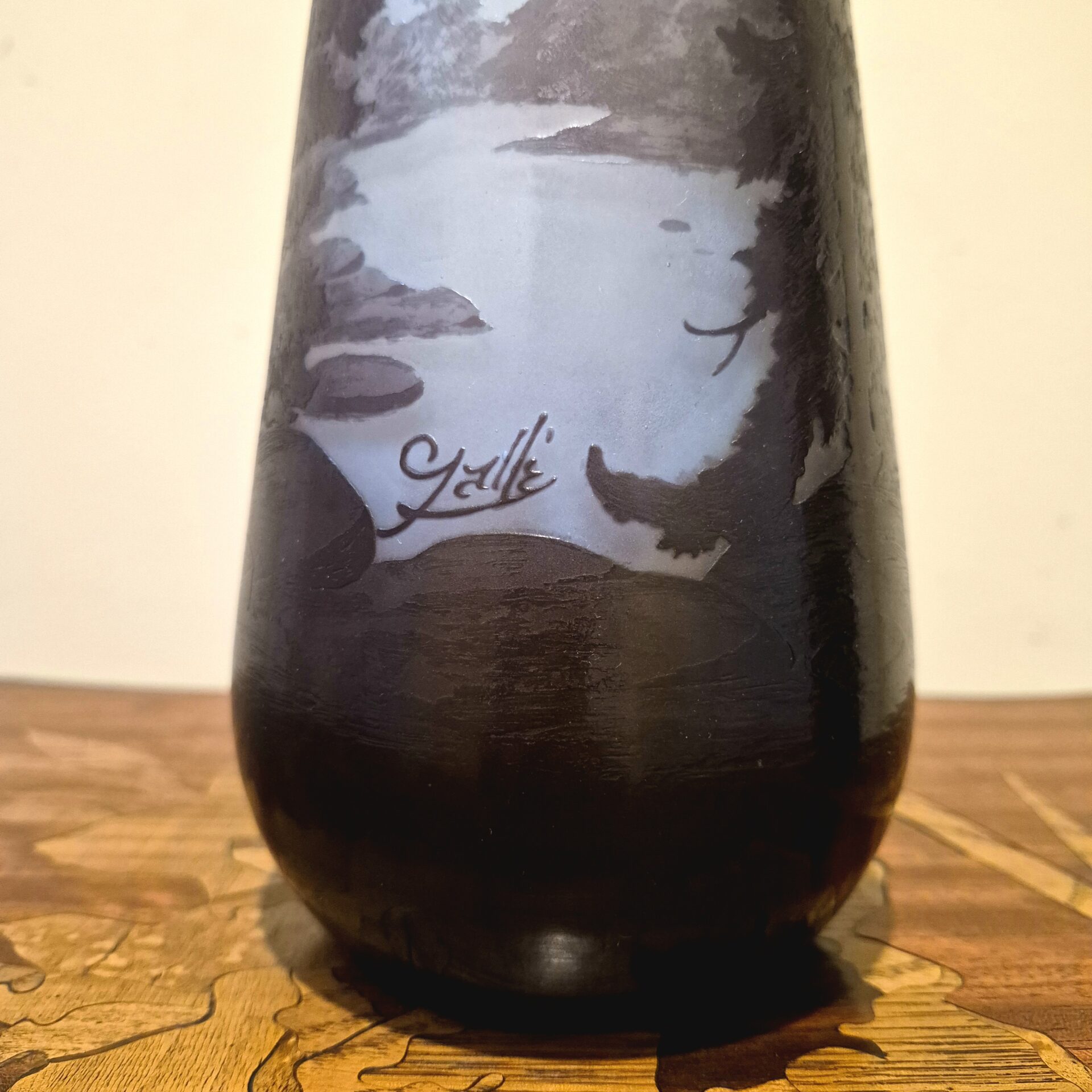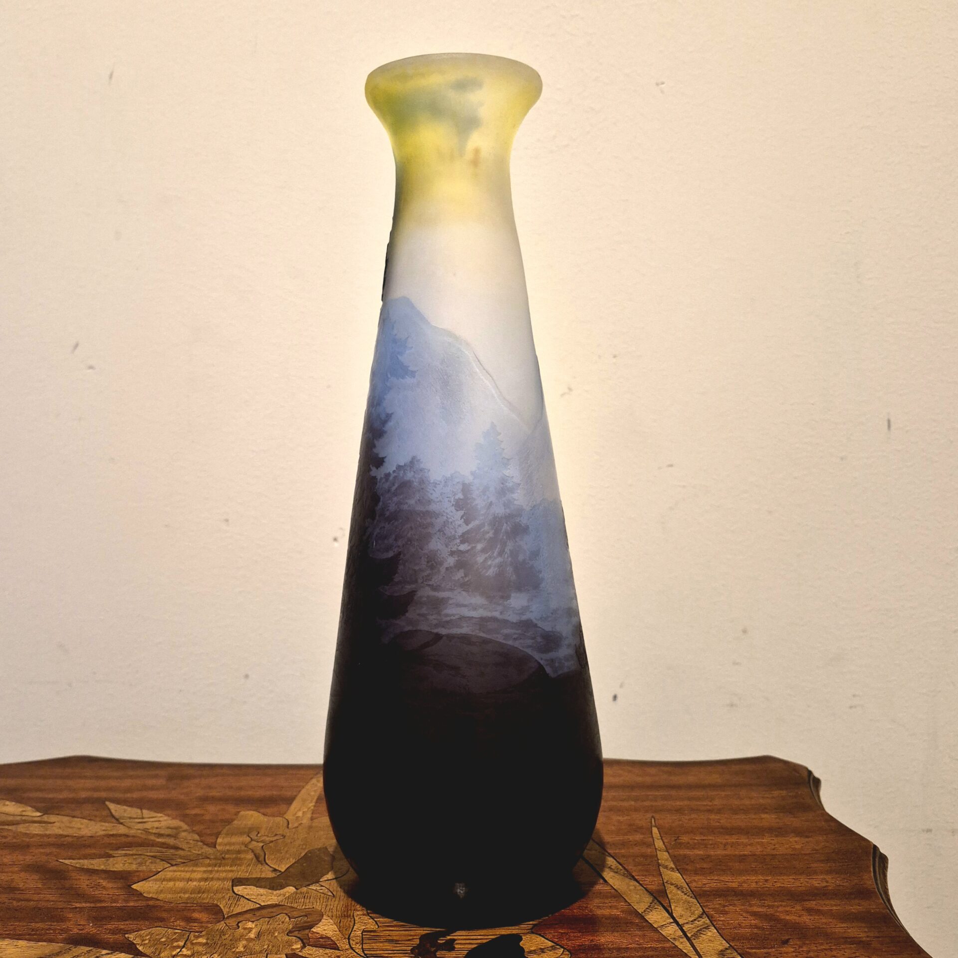 vaso in vetro multistrato, lavorato all’acido e con raffinata decorazione a motivo di paesaggio montano dei Vosgi. Firmato