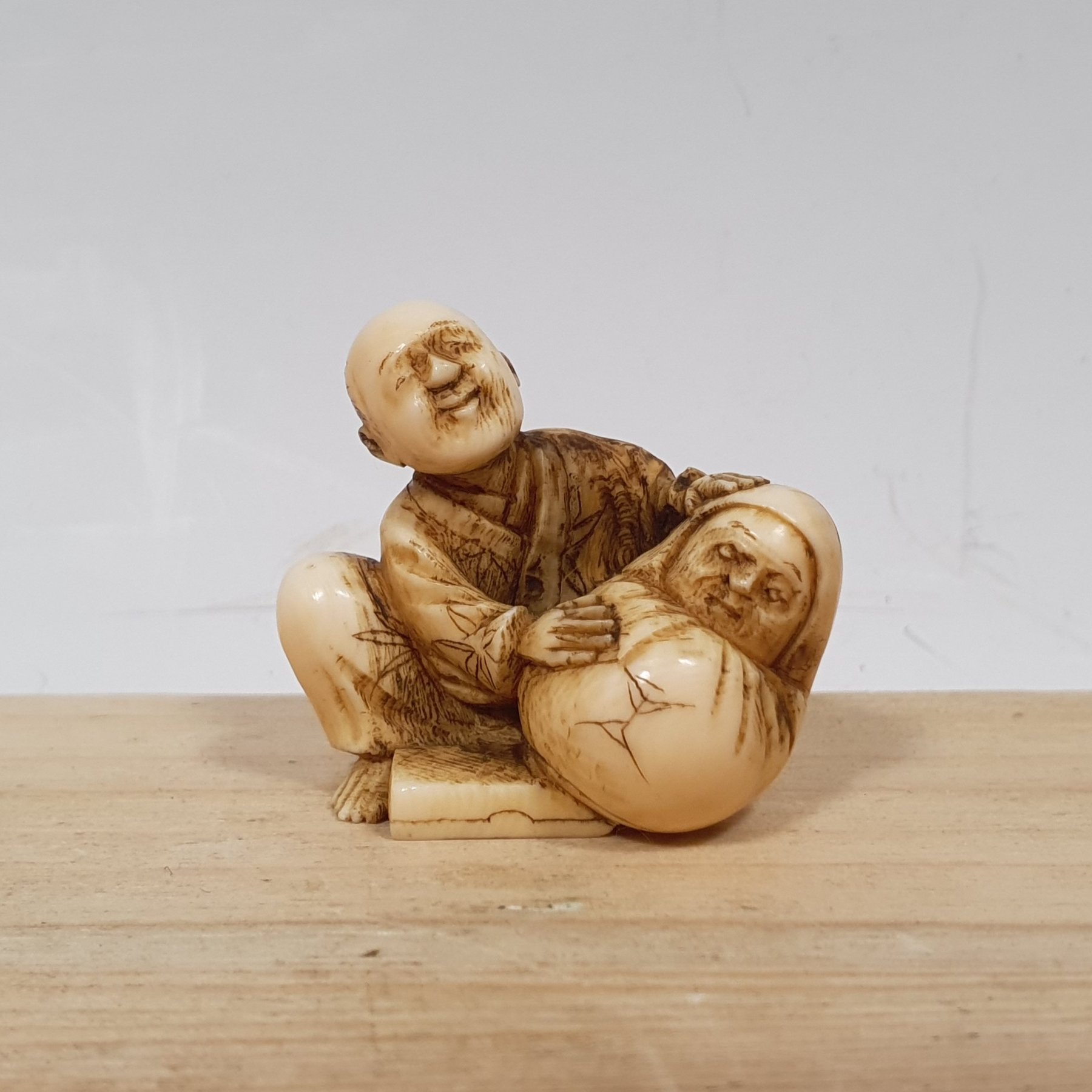 Simpatico netsuke raffigurante artigiano con Daruma doll. Firmato Masatsugu