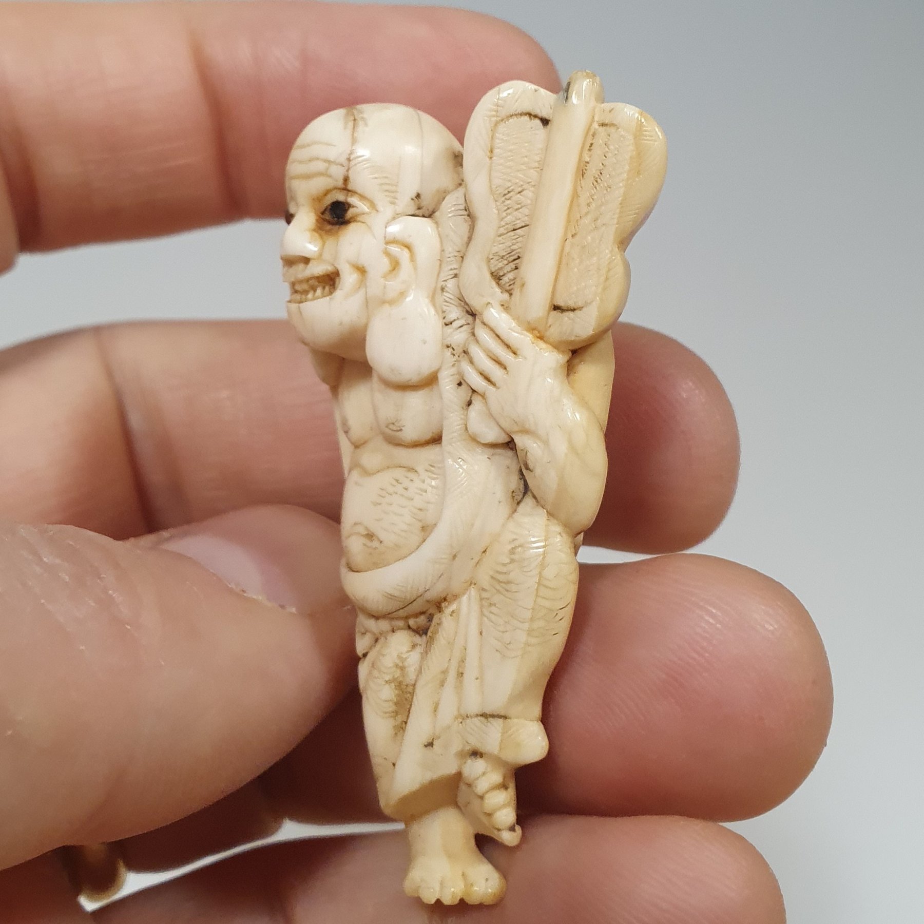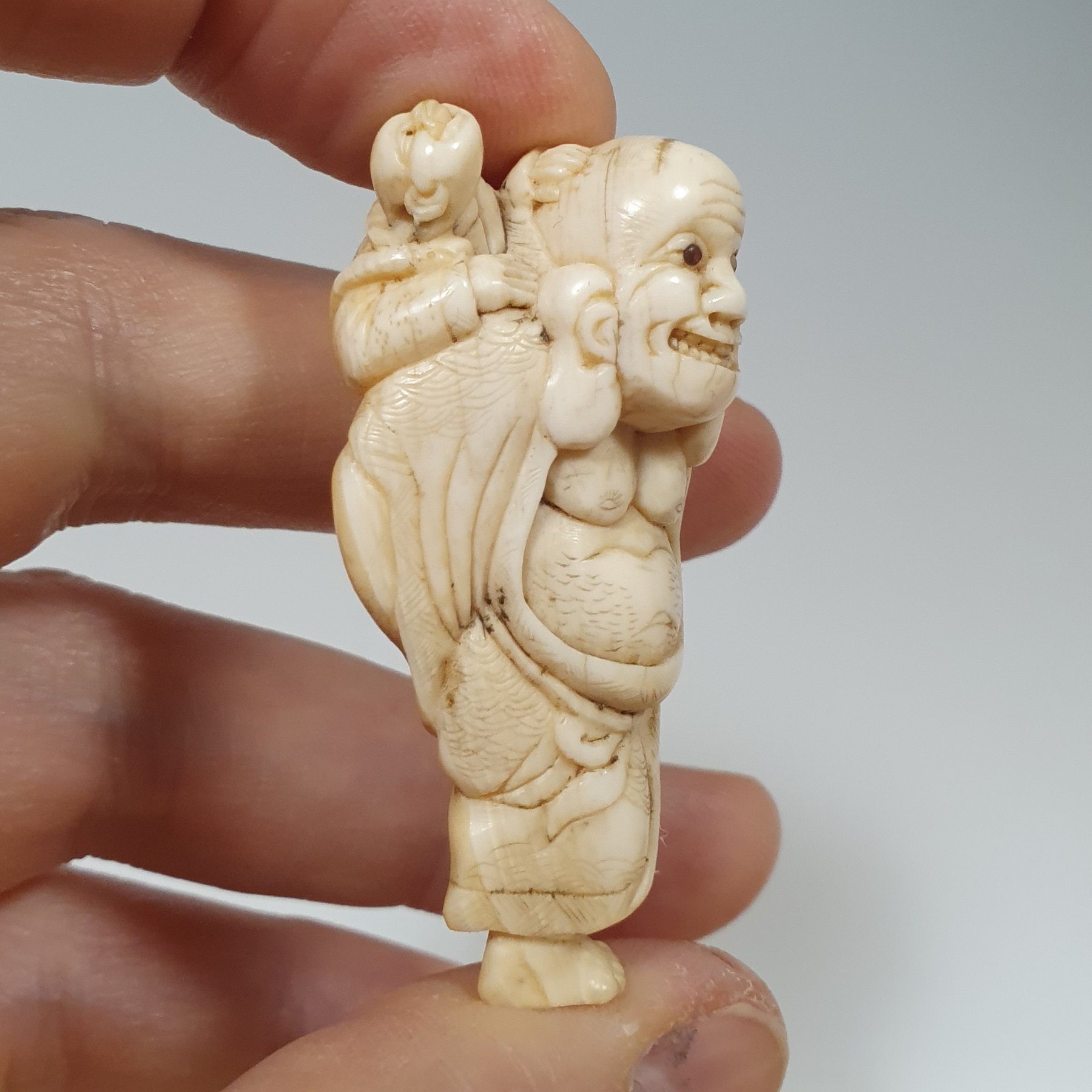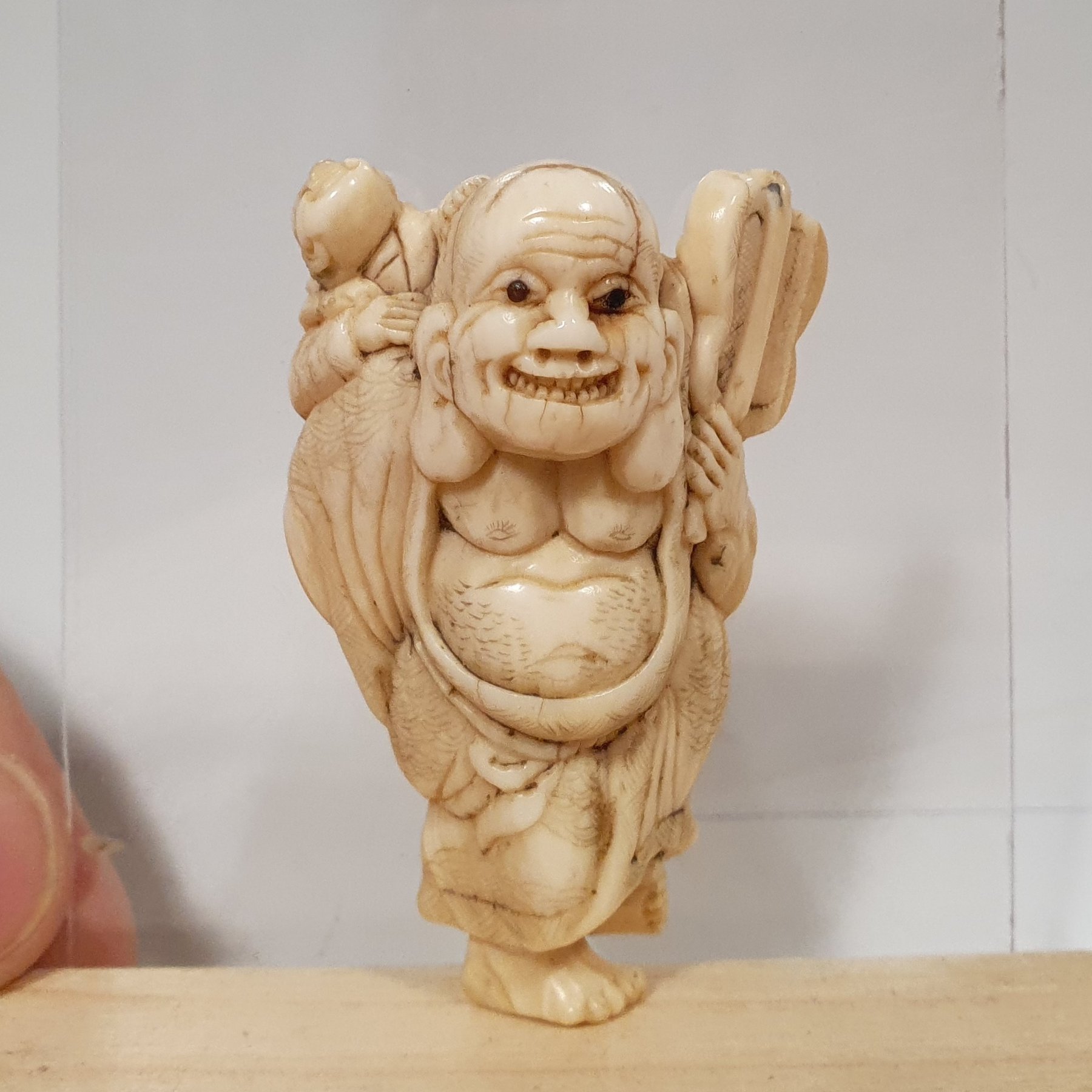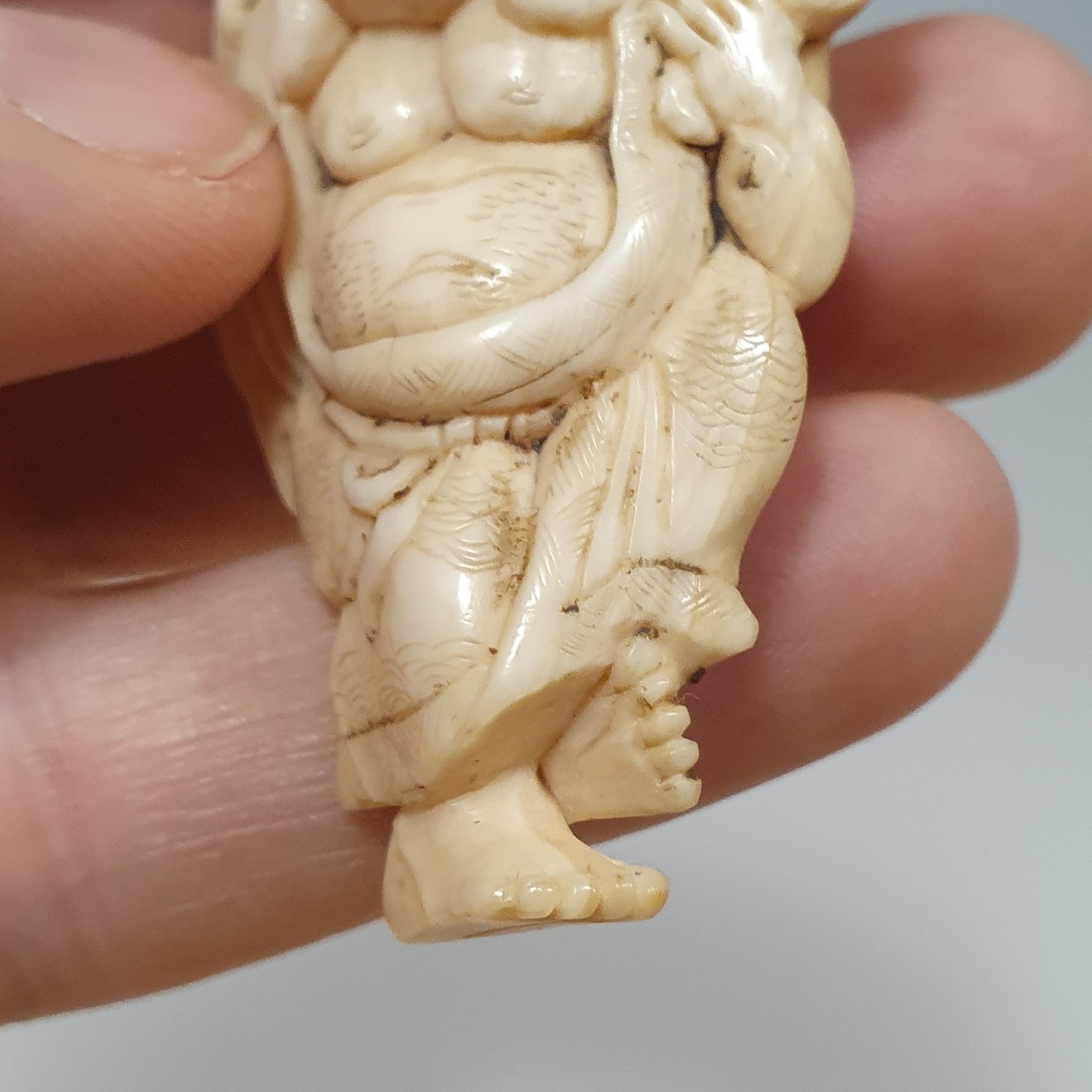 antico netsuke con bella patina raffigurante Hotei con ventaglio in mano e karako sulle spalle